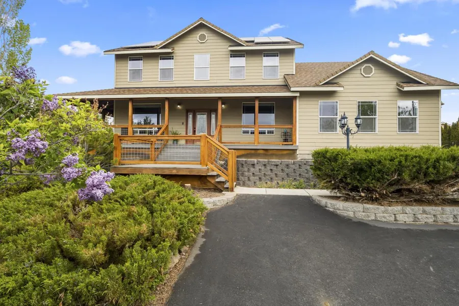 Cascade Mountain views, and adjacent to common space, a Trex wrap-around porch surrounds custom 4 bd + office home. Situated on a completely fenced 1+acre in Crooked River Ranch, this timeless Northwest home offers privacy, tranquility, and unsurpassed craftsmanship throughout. Vaulted ceilings, hardwood floors, and multiple outdoor spaces to enjoy. Chefs kitchen features solid surface counters, stainless appliances, lg working island and opens to spacious, light-filled family rm with wood ceiling. Main level home office and formal living room/dining. 2nd level: Primary Suite with spa-like bath/walk-in closet + 3 addl BR/full BA. Enjoy the terraced backyard with covered outdoor dining area, mature landscaping, greenhouse, fenced corral, and 1,296 sq ft shop with RV/boat parking and workshop. Owned solar installed. Access to river, trails, fly fishing, swimming hole, Steelhead Falls, golf, pool, farmers market, and all that CRR has to offer.
