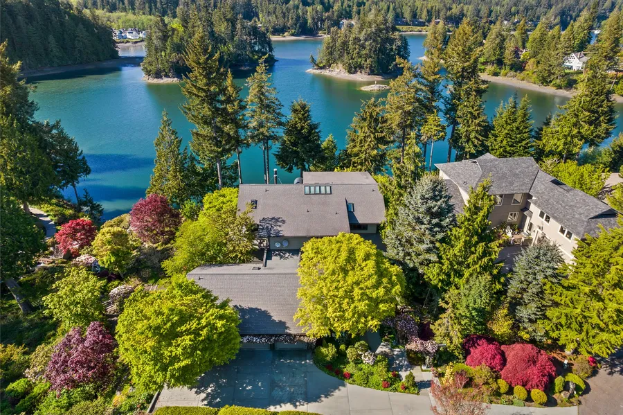 Welcome to your waterfront oasis on South Bay, where the harmony of nature meets the sophistication of contemporary living. Nestled along 163 feet of medium bank waterfront, this architectural marvel is a testament to the visionary talents of noted architects Rasmussen and Triebelhorn, in collaboration with Stephen Babbitt. Step into this masterpiece and be greeted by the awe-inspiring sight of a magnificent 35-foot, 3-story atrium. Crafted with meticulous attention to detail, the atrium serves as the heart of the home, connecting the entryway to the expansive living spaces above. An art glass bridge spans the atrium, offering a seamless transition between areas while showcasing the stunning interplay of light and glass. As you ascend the staircase, adorned with art glass treads, the facets within come alive, dancing with the natural light that floods the interior. Each step is a spectacle, a testament to the beauty of design meeting functionality. Venture to the lower level and discover a tranquil haven nestled within the home—a Japanese water garden, surrounded by an in-home spa. Here, relaxation knows no bounds, with restful meditation beds, a Japanese tub, dry and steam saunas, and space for a gym or artist studio. Additional rooms beckon with their allure—a library, office, and wine cellar await your exploration. The kitchen is a chef's delight, boasting luxury appliances and ample space for culinary creativity. A wet bar offers the perfect spot for entertaining guests, while the spacious primary suite indulges with a dressing area and walk-in closet. Throughout the home, teak wall panels, natural stone surfaces, and Venetian plaster add a touch of elegance and warmth. Every corner exudes a sense of craftsmanship and refinement, inviting you to linger and savor each moment. Outside, a waterfall and trellised entry welcome you home, while garden paths meander through a private oasis of lush greenery. Revel in the serenity of your surroundings as you soak in the spectacular views of South Bay and beyond. For peace of mind, a commercial-grade instant generator stands ready to power the entire home in case of need. A walk-in safe ensures the security of your most precious belongings, while additional living space accommodates caretakers, extended family, or guests with ease. In this unparalleled retreat, every detail has been thoughtfully curated to elevate your lifestyle and provide a sanctuary for the senses. Welcome to waterfront living at its finest—welcome to your new home.