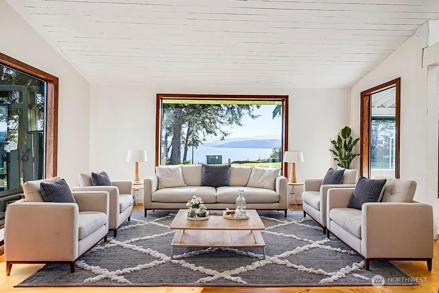 Imagine a view so stunning, it lookslike you can reach out & touch the mountains and water. This gorgeous home sits on 1/2+ acres, with irrigated flower beds and mature trees. Solid hardwood floors, a fireplace, and a wood-burning stove are part of this well-built custom house, and the primary bathroom has wonderful natural light from the large wrap-around glass block window. There are breathtaking views from the entire South side of this home and beach access just a quick stroll away. A large 2-car garage and a storage shed keep your driveway open for guests or even an RV. Fresh air and beauty right outside your door will feel like paradise. You'll see it and realize why the homeowners held onto this gem for the past 40+ years.