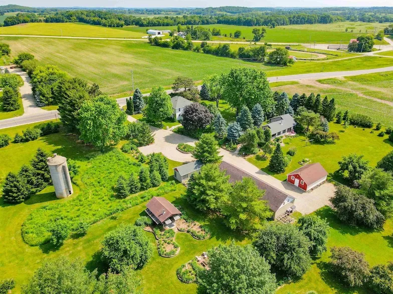 Just outside of town, this beautifully landscaped 6.94-acre farmette offers a perfect mix of modern comfort and country charm. The remodeled Foursquare Farmhouse features 4 bedrooms, a newly updated bath, new pantry, a cozy basement den with fireplace and hot tub room, plus a mudroom with half bath and laundry. The almost-finished attic adds potential for more living space. The studio, has a full kitchen, laundry room, full bath with tiled shower, closet space, and a scenic patio view. Outbuildings include a heated 68x24 workshop with attached garage, studio with storage, screened veranda, pump house, and a vintage concrete silo. With fruit trees, perennial gardens, space for trails, gardening, and hobby farming, this is a true legacy property! Legacy 6.94-Acre Farmette with Remodeled Farmhouse, Accessory Unit & Workshop Spaces