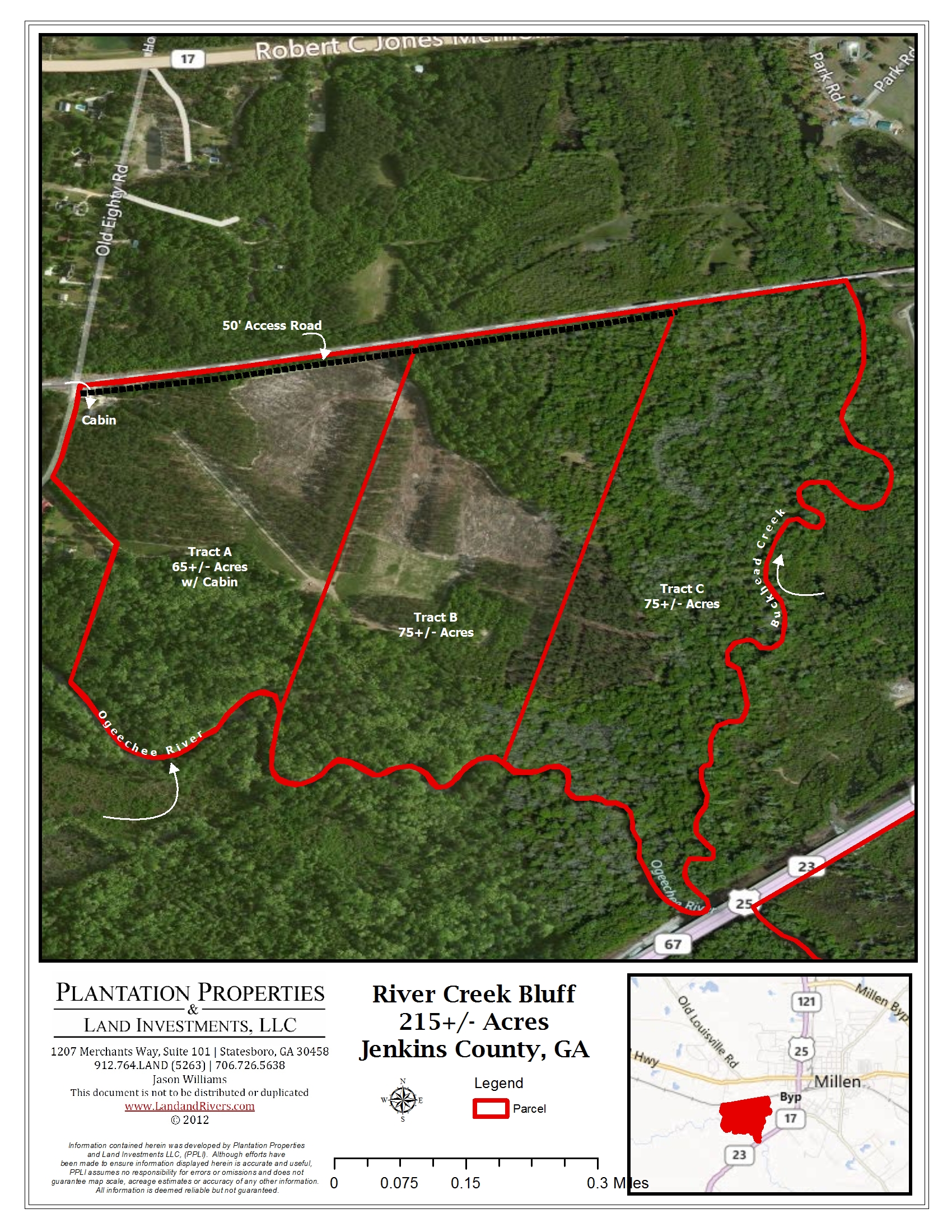 215+/- acres - River Creek Bluff is a unique property in that is situated where the historic Buckhead Creek flows into the pristine Ogeechee River. Abundant with wildlife such as deer, turkey, ducks and excellent freshwater river fishing. A Perfect multi-use property, that offers loads of opportunity. River Creek Bluff is 215+/- acres bordered to south by the Ogeechee River and to the east by Buckhead Creek. This tract features a charming small wood cabin perfect for weekend getaways or a hunting retreat, over 2 miles of water frontage with a boat landing and canal access to the Ogeechee River. The nice interior road system allows you to ramble through the beautiful hardwoods bottoms among the river and creek, and also see the large pine plantation and game food plots that have been planted in clover and wheat. River Creek Bluff is conveniently located close to the town of Millen, GA yet still quaintly secluded from the hustle and bustle of city life. Start enjoying Private, Peaceful, Spectacular year-round living, a calm weekend retreat or a recreational get-away for family gatherings. This tract is truly one of a kind and has loads to offer. Seller will divide! Call us today so we can share this beautiful property with you. 912.764.LAND