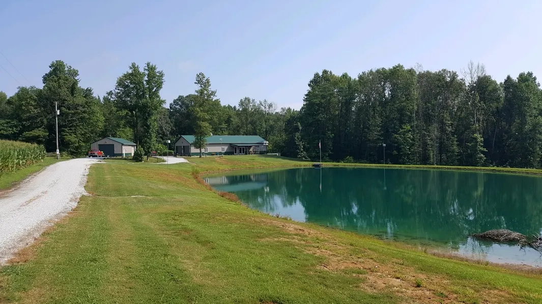 Beautiful getaway setting located south of North Vernon in Jennings County. The view overlooks your private 1 AC fishing lake or woods in back. Custom built pole barn home and garage are a must see. Two bedroom, 1 1/2 baths has room to expand for more space. Looking for a retreat from the hustle and bustle? This fully stocked pond with provide hours of fishing. The large detached garage, 24 x 48, has separate 200 amp service, 6" concrete floor, 14' door suitable for motor home storage and separate door for another vehicle to pull in. All garage doors have electronic openers. The separate machine shed is 20 x 40 with gravel floor. All doors in home are 36" openings.