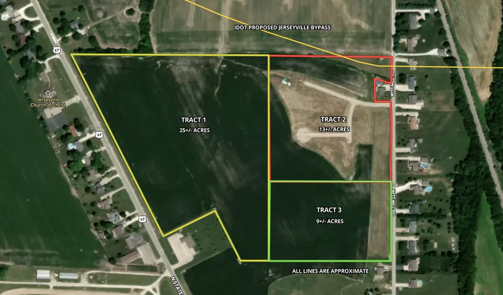 This is a great opportunity to own a piece of highly productive tillable as well as development ground in Jersey County. We will offer this property in 3 separate tracts, to be surveyed and platted after auction is complete. Tract 1 is made up of 25+/- tillable acres, over 1,300 feet of HWY 67 frontage and great potential for commercial, residential, or multi-family development. Tract 2 located off of Witt Mill Rd. is 13+/- acres and is an established residential development, offering 29 platted lots with infrastructure including streets, water, gas, and electric in place. Tract 3 located also off of Witt Mill Rd. being 9+/- acres, 7.5 of which are currently in production and would make for a great residential development. Tract 1 & 3 being sold on a per acre bases. For more info call or visit our website. Register to bid today. Being sold as/is.