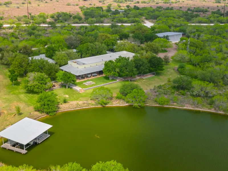 Improvements: The luxurious contemporary main lodge sits adjacent to a 7-acre lake with expansive porches, a boat house, a fire pit, pool/spa and outdoor dining with fireplaces for entertaining on cooler nights. The custom-designed lodge was built to the finest detail and includes a den, sitting room, dining room, and breakfast room included in the huge kitchen. The master bedroom is separated from the lodge and the eight guest cabanas all surround a lovely courtyard with a water fountain and live oaks. There is a game room and TV room adjacent to the main lodge. Next to the main lodge is a classic gun room for preparing for the hunt and a large enclosed equipment barn to hold the many quail rigs and hunting trucks.