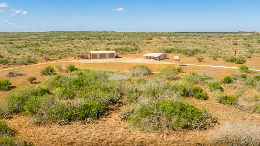 The terrain on the ranch is flat to gently rolling, covered in dense native high-protein brush and native grasses that are excellent for grazing and wildlife forage. Dirt ranch roads and trails allow for easy navigation across the property. Seven well-fed ponds on the ranch serve as watering holes for wildlife. Abundant wildlife thrive here, including axis and whitetail deer, blackbuck, dove, quail, and turkey. For hunting, there are 6 elevated and enclosed blinds, 9 ground blinds, 10 protein feeders, and 9 corn feeders. The current owners hold an Agricultural exemption on the ranch.