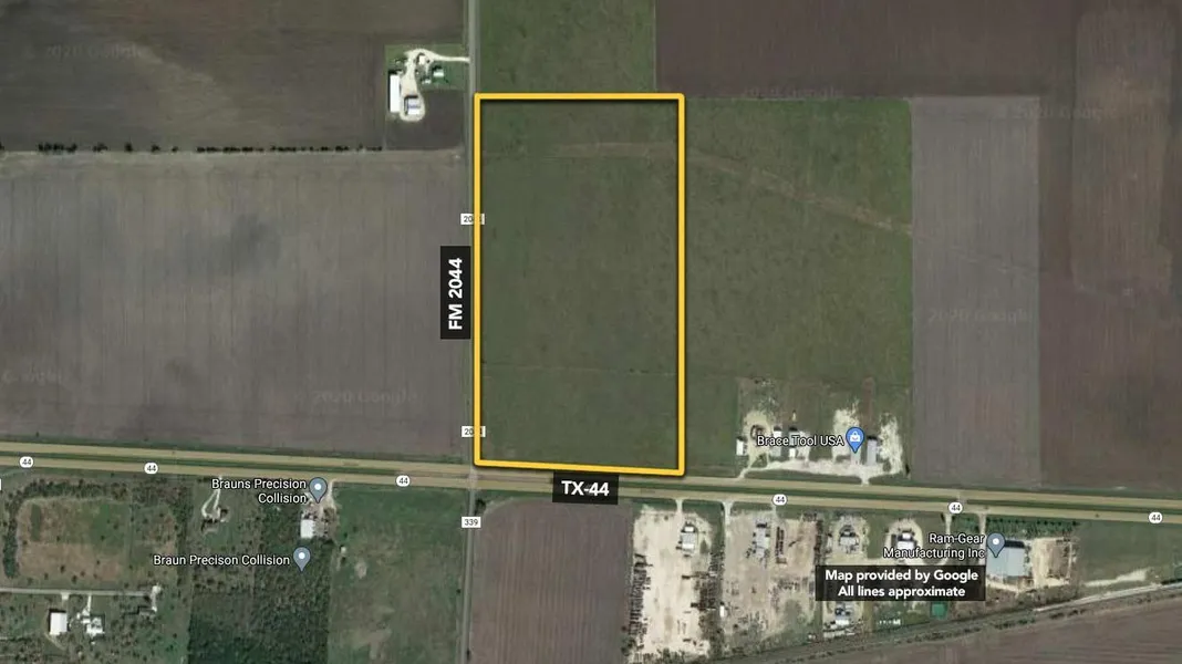 Auction Starts: 9:00 AM 11/16/2020 Auction Ends: 11:00 AM 11/18/2020 Nominal Opening Bid: Sells to the highest bidder at auction above $125,000. The property consists of one parcel, totaling 49.97 Acres, which is undeveloped pastureland fully covered in grass with no trees, fencing or improvements. It is located in an unincorporated area of Jim Wells County, approximately 2 miles west of Agua Dulce, TX and 6 miles east of Alice, TX at the northeast corner of Hwy 44 and FM 2044. The property is surrounded by vacant pastureland and across Highway 44 from several light industrial buildings fronting the highway. The property is suitable for commercial development or agricultural uses and is not restricted by any local zoning ordinance or extra territorial jurisdiction or FEMA flood zones. Currently there are no municipal utilities available alongside the property, power hookups on the property, nor driveways providing access. There are no oil and gas well sites on the property, and one buried natural gas pipeline that extends across the northern portion of the tract. Unrestricted acreage in Jim Wells County, with over 1,000 feet of frontage on Hwy 44. Ideal for light and medium industrial uses in the area. Median crossover with left turn bays at Hwy 44. 3-Phase power at intersection. Located along TX Hwy 44, approximately 30 miles west of Corpus Christi, and approximately 9.5 miles east of US-281 in Alice, TX. . 50 Acre Parcel, ideal for industrial or general commercial development. . In the County (Jim Wells) so there are no restrictions. . Over 1,000 feet of frontage on Hwy 44, and 1/3 mile on FM 2044. . Median crossover and left-turn bays at intersection for ideal access. . Northeast corner of Highway 44 and FM 2044 in Jim Wells County, TX. . Approximately 9.5 miles East of US-281 in Alice, and approx. 30 miles West of Corpus Christi In Cooperation With Note: A Buyer's Premium (Buyer's Fee in WI) will apply for this property. Please see Terms of Sale for details. Broker Licenses: TX Jeffrey Michael Ashby RE LIC 550021; Monte W. Lowderman AUC LIC 00015800