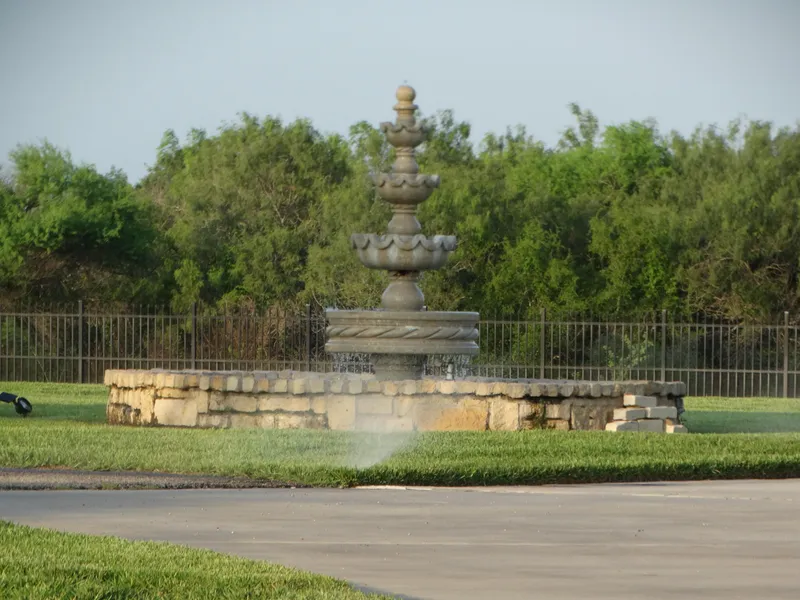 Beautiful, fenced yard with landscaping, circle drive and fountain