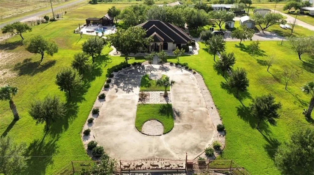 This 10-acre corner lot estate is impressively secured with an 8-ft high fence & dual automated entry gates. The main residence, situated on the southern half of the property, boasts 3 bedrooms, 2.5 baths, tile flooring, granite countertops, & stainless appliances in the eat-in kitchen. Outside, a luxurious heated in-ground pool with spa awaits, complemented by a striking cabana equipped with a half bath/changing room. A separate 2,400 sq. ft. insulated workshop flanked between two 1,200 square foot apartments: one-a spacious room with a full bath, tiled floors, cedar walls, and ceilings; the other, a 2-bed, 1-bath unit. The northern half of the estate features a 15-ft deep pond teeming with catfish, crawfish, perch, & minnows, ideal for fishing good eating. Additionally, a colossal 7,200 sq. ft. metal building stands ready to meet your business or storage needs. This unique property is truly a MUST SEE! Complete with a sprinkler system feeding the yard, oak, pecan, & fruit trees.