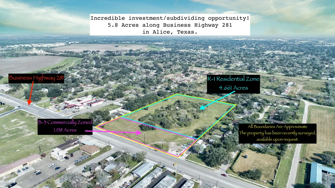 5.8 acres in Alice, Texas with prime frontage on Business Highway 281 offering 1.158 acres zoned commercial, and 4.661 acres zoned residential.