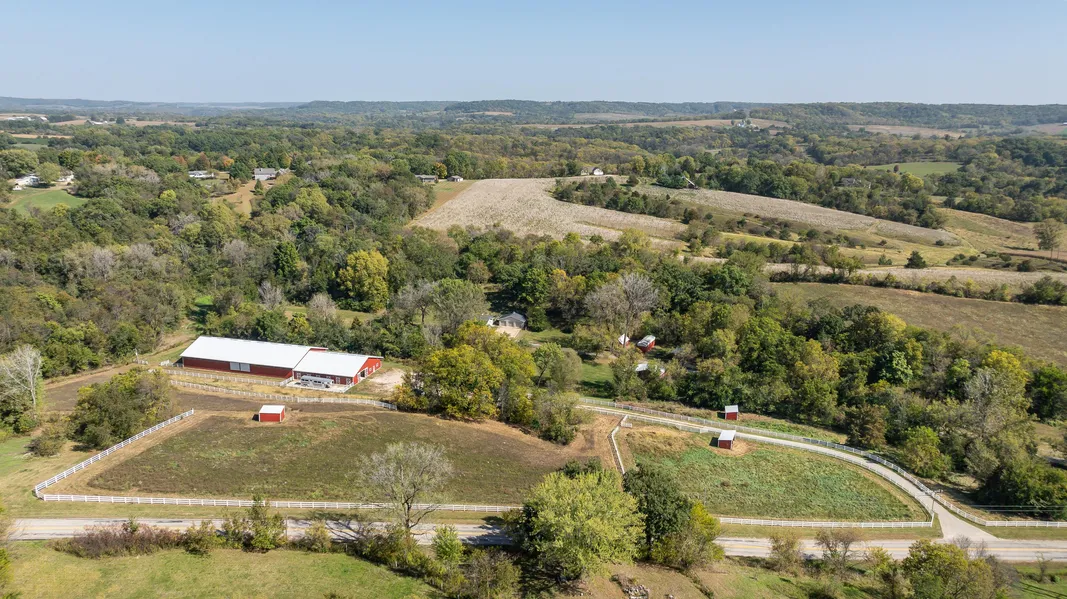 Discover this picturesque equestrian farmette, set on 19 stunning acres featuring a serene creek and four lush pastures all with automatic waterers and lean-to shelters.This unique property boasts a fully equipped 70' x 144' one-story barn built in 2013, complete with an RV plug and new concrete pad. The barn includes radiant in floor heat in the walkway, eight spacious stalls with automatic waterers, a hot/cold wash stall, and an indoor arena equipped with an advanced air filtration and ventilation system, along with a sprinkler systemideal for training and events.