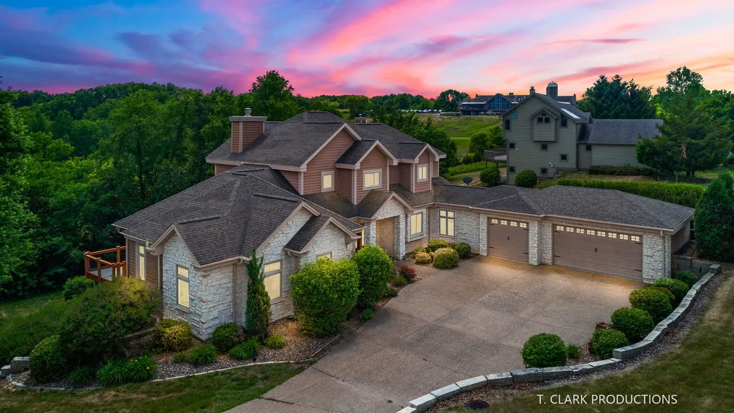 Almost 6000 sq ft of finished living space in this gorgeous open floor plan home retreat located near Galena's Eagle Ridge Territory "General" Golf Course!! Situated on .86 acres surrounded by hills and trees and lovely view of the golf course. The "Territory" has amenities including, shopping, dining, fuel, groceries and more. This home was built in 2000 with no expenses spared and includes 4 all-suite bedrooms, including primary suite on first floor plus 4 full and 3 half baths. Large foyer greets you to custom staircase and stunning 2 story living room with vaulted wood beam ceiling and floor to ceiling windows, stone gas fireplace and sweeping views of deck and landscaping. Kitchen with all HIGH-END stainless- steel appliances, large center island offers counter seating plus eat-in table space, granite countertops & walk-in pantry. First floor mudroom and laundry room plus powder room. Enclosed sunroom off kitchen. Dining room with crown molding, huge bay window and hardwood floors. Private office or den with French door, fireplace and hardwood floors with view of the course and built-in bookcases. First floor hosts huge primary suite with trey ceiling and giant walk-in closet plus door to private deck. Primary bath with heated floors, double vanities plus walk-in shower and whirlpool tub. Upstairs hosts large loft with wet bar and powder room, overlooking living room. Ensuite bedroom with vaulted ceiling private deck, walk-in closet and large bath with walk-in shower and bathtub. Walkout lower level features heated floor, wet bar, fireplace, media room/playroom, 2 additional ensuite bedrooms one with steam shower and private deck. Exterior of home is stone and cedar with 3 car attached garage. Maintenance free multi-level decking. Walkout basement has additional attached storage garage open to backyard. 2 new Furnaces 2023. New furniture in the house is negotiable to stay in home. This beautiful home is a must see!