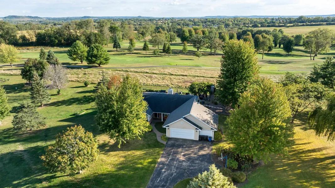 Exceptional contemporary ranch with golf course views, three car garage, generous layout and resort-style outdoor oasis! Set in the desirable Galena Golf View Estates, this sprawling contemporary ranch pairs elegant design with an unbeatable outdoor entertainment experience, all overlooking the picturesque 11th hole of the Galena Golf Course and beyond. The main level welcomes you with a dramatic great room featuring soaring vaulted ceilings and a cozy gas fireplace, flowing seamlessly into an upscale kitchen outfitted with stainless steel appliances, gorgeous granite countertops, and a convenient eat-at breakfast bar that flows directly to the light-filled dining area with access to outdoor entertainment area just beyond. Two generously sized guest bedrooms share a beautifully appointed full bath with vessel sink, while the expansive primary suite provides a luxurious escape with a walk-in closet and spa-like private bath boasting above-counter dual sinks, a steam shower, and a relaxing soaking tub. The finished lower level extends your living and entertaining space with a large family room that accommodates a variety of layoutsmedia zone, game space, or bothas well as a den/study, full bath with second walk-in steam shower and antique-style vanity, and an expansive flex room great for hobby, office, or gym. Step outside to a stunning fenced stamped concrete patio designed for privacy and unforgettable entertaining. Surrounded by landscaping, this outdoor retreat features abundant seating, a pergola-covered wood-burning fireplace, and a fully equipped outdoor kitchen with built-in Viking grill and two door cooler. The centerpiece: a pristine in-ground swimming pool perfect for summer fun and relaxation, all with a backdrop of incredible golf views and abundant panoramas. Additional highlights include a large front yard, attached three-car garage with ample room for vehicles, toys and storage, asphalt driveway, and a charming covered front porch. The property is served by a shared community well and is subject to applicable covenants and restrictions.