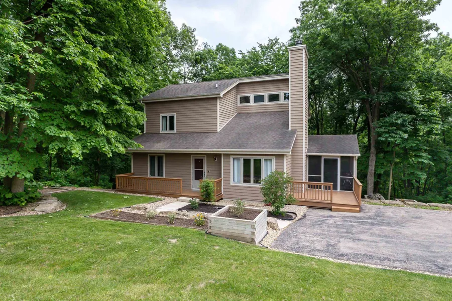 Nestled on a tranquil wooded lot in The Galena Territory, this inviting 3 bedroom, 2 bath contemporary retreat offers a perfect blend of comfort, natural beauty, and versatile living space. Set on .82 acres and bordered on two sides with greenspace that houses a rustic trail, the home is surrounded by mature trees and thoughtful landscaping, with raised planter beds, limestone accents, and a gently sloping backyard that creates a private, park-like setting. Inside, the main level welcomes you with a bright and airy open layout. A spacious living room features cathedral ceilings, a striking woodburning fireplace, and access to a generous screened porch and connected front deck that invite you to relax and take in the peaceful wooded surroundings. The adjoining kitchen offers ample cabinetry, stainless steel appliances, an island with breakfast bar, and a dedicated dining area overlooking...