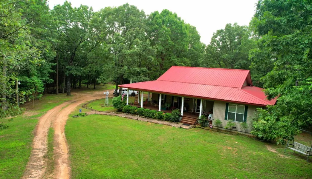 Welcome to your dream retreat! This stunning 2292 square foot home, nestled on 35 acres of pristine land, offers unparalleled privacy and tranquility. Enjoy the outdoors with 643 square feet of covered porches, perfect for relaxation. The property features a detached 2-car carport, an enclosed 2-car garage, a charming she shed, and an additional shed for storage. Constructed with robust 10-inch concrete walls, concrete piers, and trusses, this home is built to last. The metal roof ensures durability, and there's even timber on the property ready for harvesting. Inside, you'll find three spacious bedrooms, two bathrooms, a versatile bonus room, and a secure safe room. Located outside of city limits on a peaceful dead-end county road, this property offers the perfect blend of rural living.