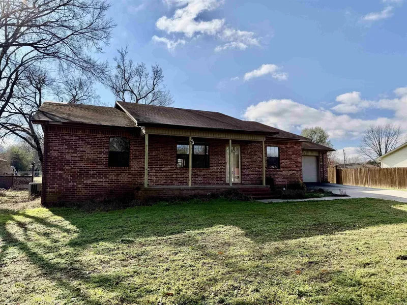 This charming brick home near the Arkansas River offers comfortable living with covered front and back porches, a large fenced lawn with shade trees and storage, and fresh neutral interior paint. The open-concept living, dining, and kitchen area features a galley kitchen with oak cabinets, a breakfast bar, and all appliances including the refrigerator. A split floor plan provides privacy, with the main suite offering a walk-in closet and shower, while a separate laundry room and new hot water heater add convenience. Well-designed, this home blends function and charm in a peaceful setting.