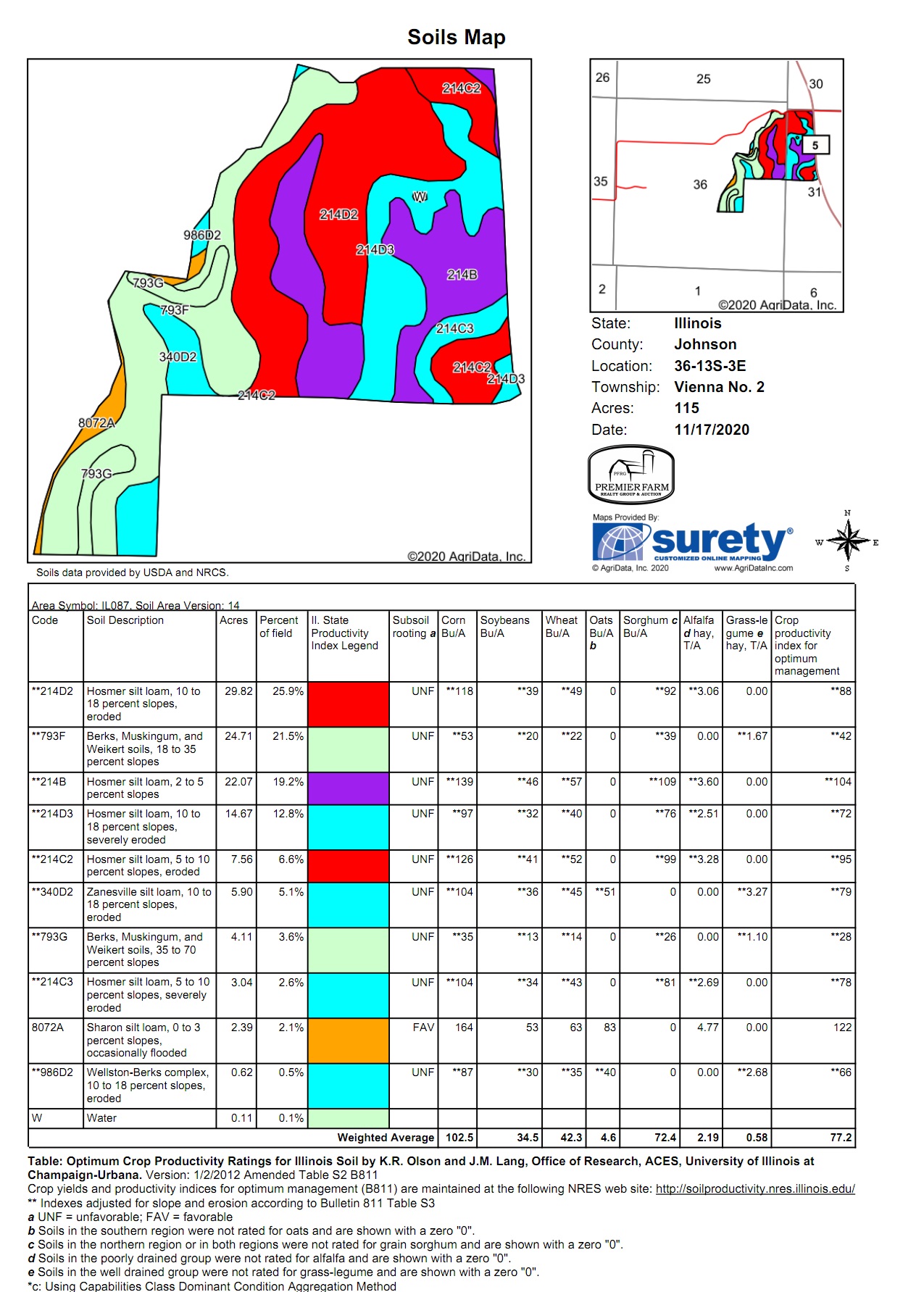 Search for detailed parcel information including; Elevation & Vegetation Maps, Ownership Information, Detailed Parcel Information, Crop History Map, Soil Survey Productivity Data, and more.