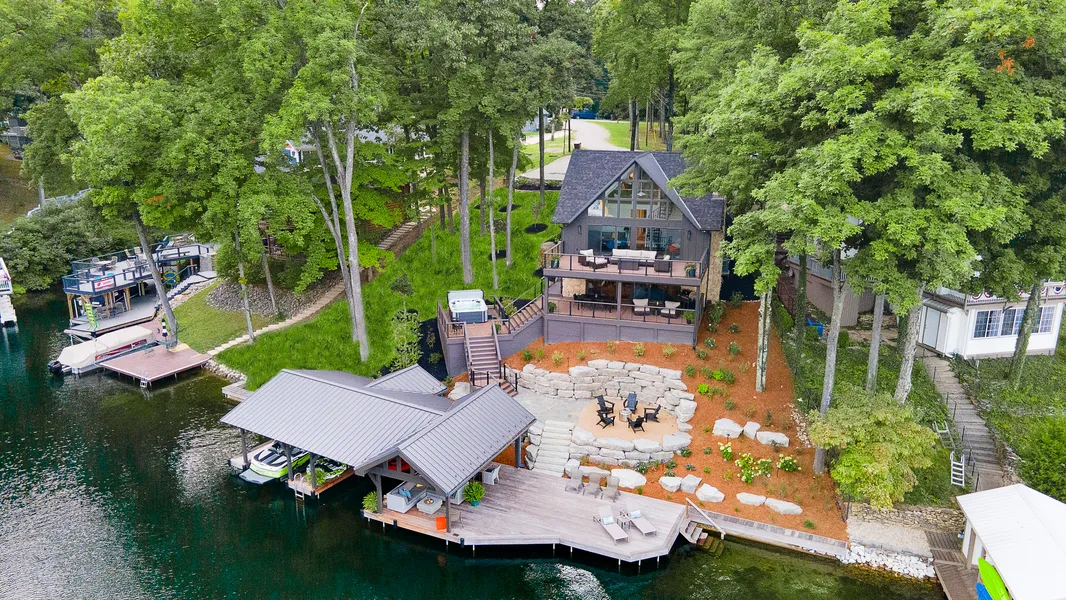 Lakeside luxury at breathtaking Sweetwater oasis, completely revamped by owners who've cherished it for decades. Posh transformation blends contemporary flair seamlessly. Open kitchen dazzles w/European-style cabinets, roomy island, walkin pantry & chill bar area. Sunshine floods all 3 lvls thru south-facing setup delivering dreamy lake views. Outside 2500+ sqft haven w/hot tub & firepit. Premium picks like Hardie Plank siding & TimberTech decking mean easy upkeep. 3 lots, 120 ft lake frontage, ipe wood dock, covered lounge/dining spots & dbl boat slips - this is your ready-to-enjoy lake hideaway, fully turnkey. Enjoy live music at Hard Truth Hills, Brown Co Music Center or Playhouse as well as golf at Salt Creek & foodie meal at Story Inn.