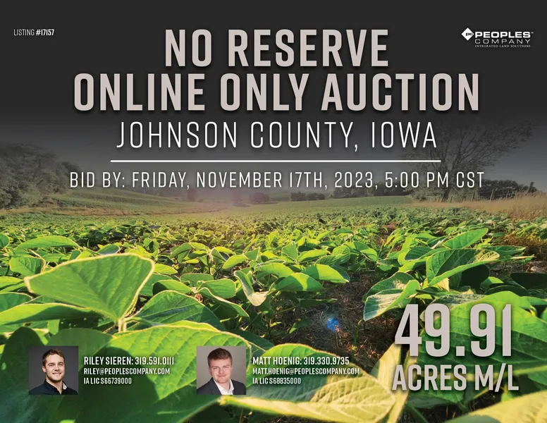 Save the date Friday, November 17th, 2023, at 5:00 PM Central marks the ABSOLUTE NO RESERVE Johnson County, Iowa Online Only Auction, an opportunity you won't want to miss! Peoples Company is pleased to presents a hard-to-find, 49.91 acres m/l of scenic land in Johnson County, nestled within the Iowa City metro area. This picturesque farm will be auctioned off exclusively online, selling absolute with no reserve, offering endless possibilities for potential buyers. Situated on Kansas Avenue SW, this property boasts numerous advantages, including multiple building sites, a charming county ambiance, and a wide array of recreational and farming possibilities.