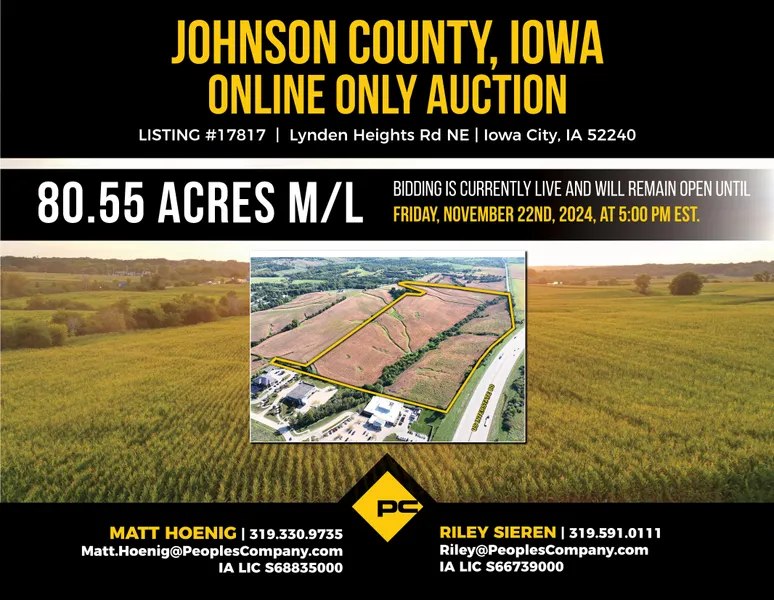 Johnson County, Iowa Land Auction - Mark your calendars for Friday, November 22nd, 2024. Peoples Company is proud to present 80.55 surveyed acres for auction, located partially within the city limits of Iowa City, along Interstate 80 in Johnson County, Iowa. This prime, tillable transitional development farmland is offered as a single tract through a TIMED ONLINE ONLY auction. Bidding is now live and will close on Friday, November 22nd, 2024, at 5:00 PM EST.