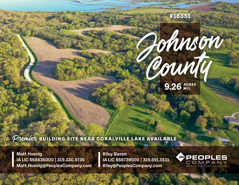 Peoples Company proudly presents a premier 9.26-acre buildable lot in Johnson County, Iowa, offering a rare combination of privacy, natural beauty, and convenience. Tucked at the end of a quiet dead-end road just south of Swisher, this stunning property is surrounded by mature timber and rolling hills, creating an ideal setting for a custom home, hobby farm, or peaceful retreat. The topography may support a walkout build with expansive second-story views overlooking the picturesque Iowa River corridor.