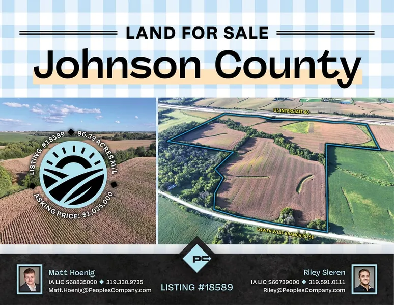 Peoples Company is pleased to present 96.39 acres m/l located just minutes from Iowa City. Owned by the same family for more than 50 years, this highly productive Johnson County farm offers a rare opportunity to acquire a proven farmland investment with income potential, recreational appeal, and future building opportunities.