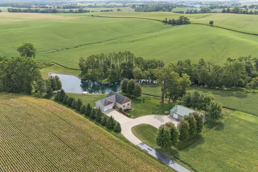 Turnkey acreage retreat — custom-built A-frame home on 4.2 private acres with a fully stocked pond, stone firepit area, and a heated 40×60 shop featuring RV/boat bay + bathroom. Ideal for executive relocation, Airbnb/STR income, or remote work living just minutes from Iowa City and Cedar Rapids.