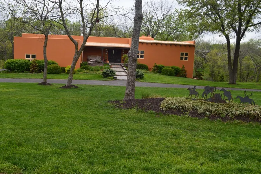 A very unique Southwest Style home nestled in a treed setting on acreage! Home has been updated throughout. New exterior paint. Picturesque gold fish pond at the homes entrance. A Chef's dream kitchen with an exquisite Garland commercial oven, granite countertops & tile backsplash. Wood floors throughout the 1st level w/incredible pine ceilings. Two fireplaces. Tiled floor in walkout basement. Large 2 car attached garage. Breath taking view off the back deck overlooking a serene Lake! 3 Stall horse barn with shop. There is a tack room & lots of storage space in the barn/shop. Walnut trees. A park like setting with a firepit makes for a wonderful relaxing atmosphere.