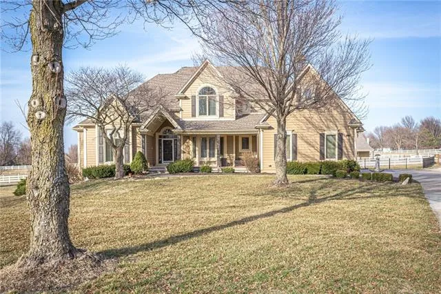 Come home to nearly 4 glorious acres. The large 1.5 story home offers new updated hardwoods throughout, an open floor plan with tons of storage, designated offices and several bonus rooms! Outside is the pool and new deck. A short walk will take you down to your amazing barn, with a new roof, four stalls, wash rack, hay loft and separate garage. Perfect for horses, toys or a separate office/shop. The location can't be beat, five minutes from dining and shopping. Blue Valley schools. 15 mins to downtown. This small acreage estate has been improved with many updates including new hardwood flooring throughout, new roof on barn, grading in paddocks and around property, retaining wall around pool, dog fence, concrete added in several areas and more!