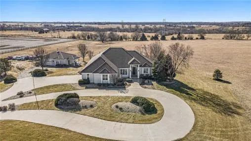 WOW! Great location on blacktop. Custom built 4 bedroom home & fantastic outbuilding on 20 acres! Perfect equestrian setting or just to enjoy great privacy yet still close to everything! Gourmet Kitchen with Maple cabinets, double ovens, walk-in pantry, built-in frig, 5 burner cooktop and new appliances! Cozy main floor Master suite with huge windows. Master bath features whirlpool tub with fireplace, walk-in tiled shower and huge closet. NO steps from 3 car garage into home makes the main floor very accessible. Beautiful great room features a fireplace with walk out to screen porch. Living room and dining room are perfect for entertaining. Walkout lower level boasts a fun Family Rm, wet bar/second kitchen, built-in office, two bedrooms, full bathroom & cedar closet. Covered deck & stamped concrete patio. New HVAC & Hot Water Heater 2020. New water softener 2017. Sprinklers. Sec Sys. Aluminum clad windows. Beautiful Tile roof. Circle Drive. Stamped concrete front walkway. Lovely flower gardens. 32x40 Shop/Outbuilding w/radiant floor heat, water, 200 amp electrical service & double overhead door. Great for many hobbies and could be converted to a stable as well.