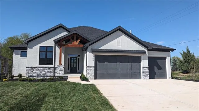 Lot 52 - BCI-Bowen Custom Homes newly designed Reverse 1.5 Story Plan-The Crawford. MAJOR PRICE IMPROVEMENT OF $30,000!!! This home is move-in ready! Boasting many outstanding features, including exterior stone trim, a covered entry, four-sided stucco, 3 car garage with 8' tall decorative trim doors, painted exterior trim on all four sides, all a must see. The open and welcoming floor plan features a light-filled great room with a wall of windows with transoms above. It also includes a floor-to-ceiling stone fireplace, a kitchen with a large island, beautiful cabinetry, and a large walk-in pantry/prep area, as well as a dining area that opens to the covered patio. The primary bedroom and two additional bedrooms, each with private baths, are located on the main level. The lower level is complete with a recreation room, walk-up bar, plus a fourth bedroom and bath. A fantastic home in an excellent location! Seize the opportunity to move into a stunning Matt Adam community! Brand-new home in Mills Crossing, served by the finest Blue Valley Schools. Residents and their guests can enjoy a community pool and a covered cabana with a stone fireplace. Children in the neighborhood attend the highly-regarded Blue Valley School District. Act quickly...