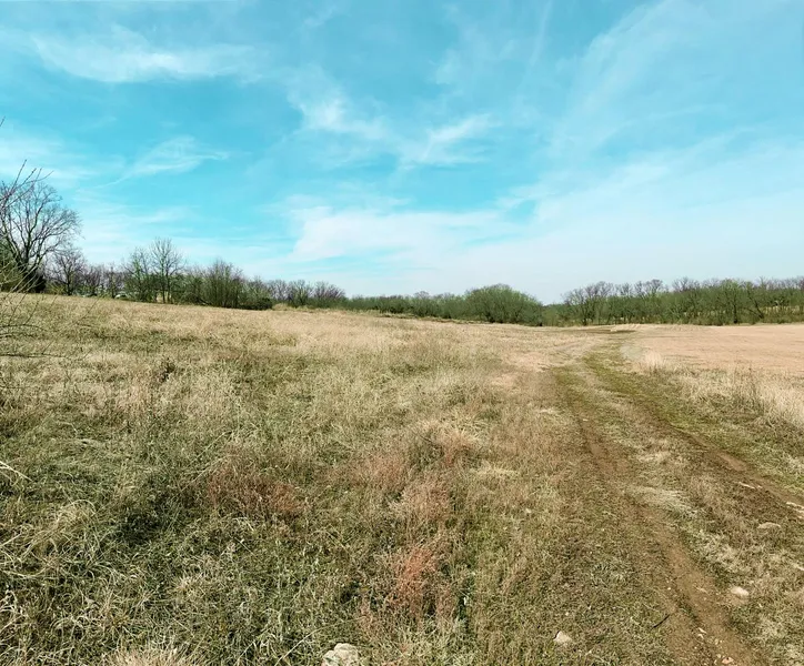 Property has frontage on the north side of W 79th St several hundred feet east of Mize Road, and approximately 1000 feet of frontage on the east side of Mize Road. Sloping land with some trees and a stream running diagonally through the property.