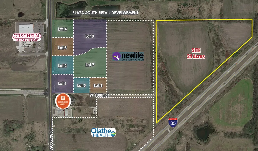 site zoned for Plaza South Retail, abutting Gardner Rd with 8 pads for restaurants, hotels and senior living.