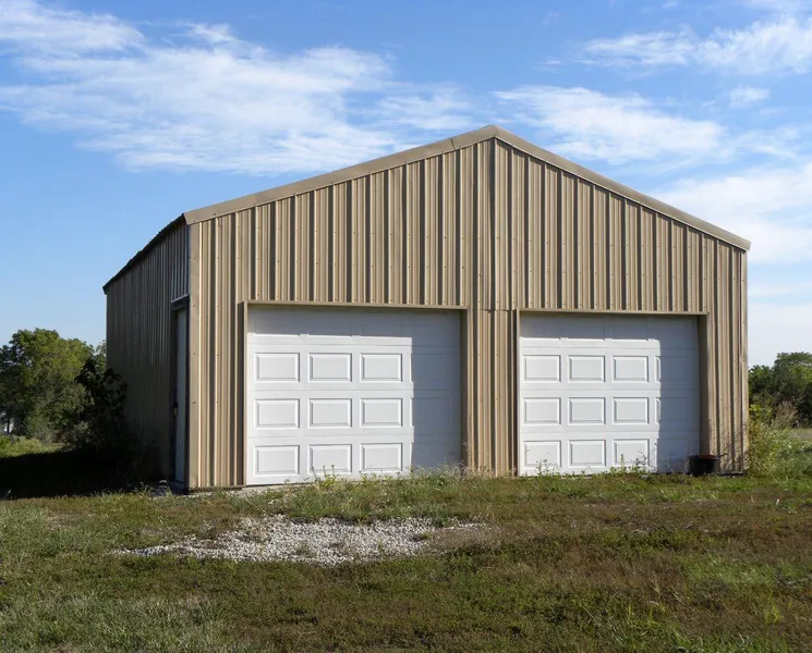 30X24 metal garage with gravel floor 2-overhead doors and walk-in door, built with trusses, water spicket available and in use, mostly wooded 5 acres.