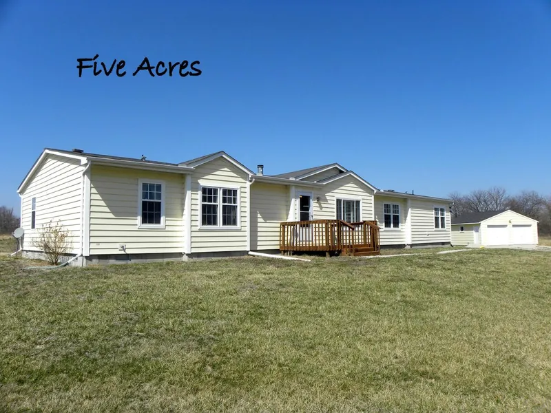 Spacious home on 5 fenced acres, on permanent foundation with crawl space plus built-in storm shelter, tons of cabinetry and huge island in kitchen/dining, stone fireplace in vaulted great room, large master with walk-in plus double vanity, garden tub and 4ft shower, laundry/mud room with entrance from outside, detached 2-car garage with openers & 220 electrical, 24x30 barn with electricity and water spigot.