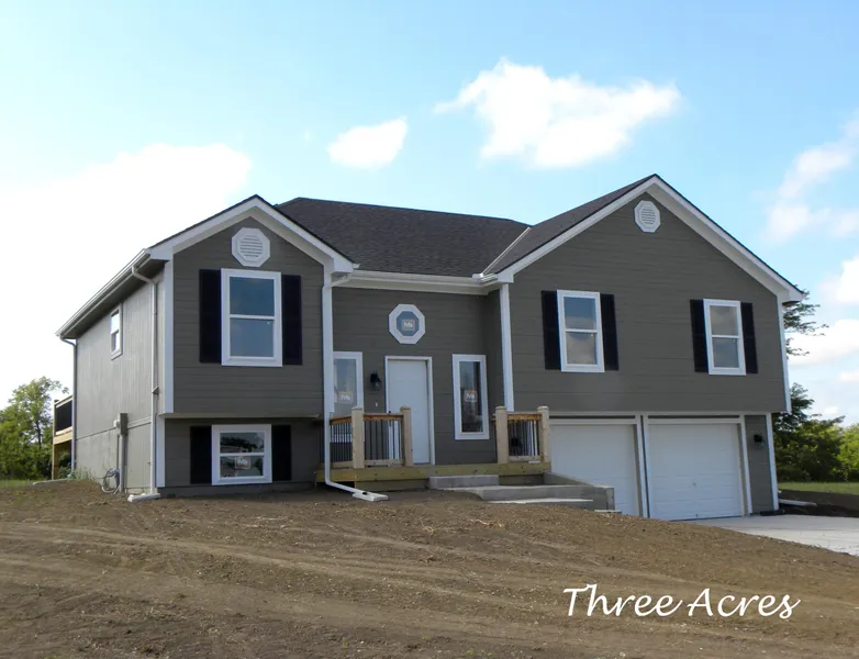 New home on acreage, tree-lined backyard with custom cabinetry in country kitchen, fireplace in living room, large walk-in closet in master, plenty of closet space, main floor laundry room, stubbed basement and oversized garage to have workbench area also, 11x11 deck with 12x5 ft. front porch.