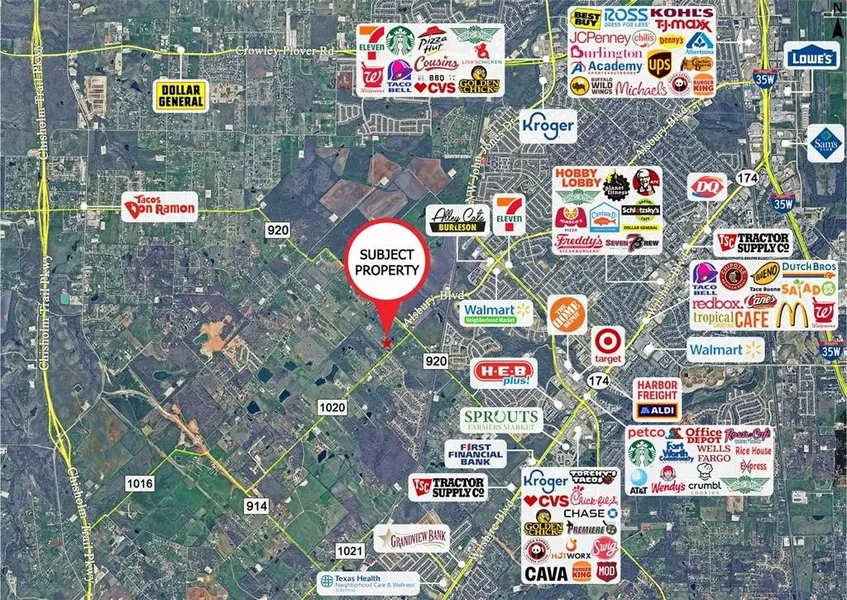Positioned near major retailers, 3 miles from Chisholm Summit proposed master-planned community and Hooper Business Park. Includes 2415 sq ft home with 3 bedrooms, 3 baths, large open living area, and enclosed back patio. Multiple covered parking areas and RV parking. Value is in the land and location. Property is not currently zoned Commercial it will be up to the buyer to convert to commercial. Buyer to check with City of Burleson, Planning & Zoning and future land use.