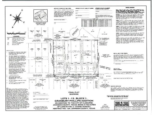 This tract of land has 13 plated lots,(4 Multi family, and 9 residential) ready for Builder's to get started developing. It is on a corner lot property and backs up to the Preston Meadows subdivision. Easy access to Chisolm Trail Parkway. The property is in the Cooke Elementary, Wheat Middle, and Cleburne High School district.