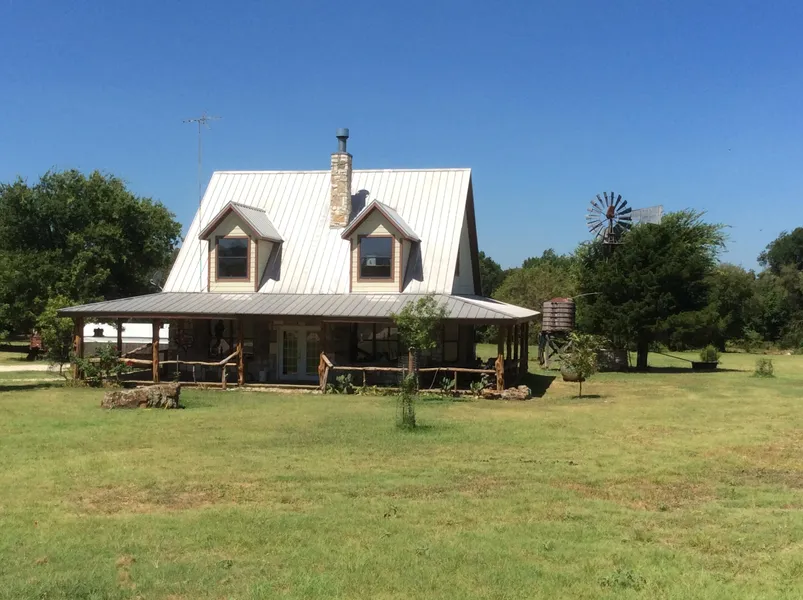 4.7 acre,Rustic country home, wrap around porch,cedar post railings,wood plank floor.2-BR 2-BA with stamped concrete down, wood floor upstairs. Ceramic Tile bathrooms. Nice kitchen with glass front cabinets, antique replica cook stove rock wood burning see-thru fireplace.Walls are barn wood.ceiling is rustic metal,Unique home with unique features. Loft upstairs can be 3rd bedroom by adding a wall and door. Master shower has inlay Cross & Longhorn - 30 X 40 Metal workshop, old 1BR 1BA home used as storage, stock tank, storm shelter.