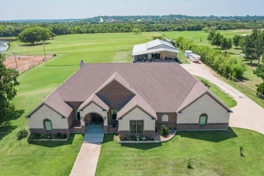 Beautiful horse property on 10 acres with an 8 stall barn with lighted arena. Coastal hay provides the Ag exemption. Home boasts an open floor plan with high ceilings and lots of natural light, 3 bedrooms, 3 full bathrooms and office and media room. Chef's kitchen has 8 burner gas stove and center island with granite counter tops that opens to the double doors to the covered patio, perfect for the entertainer. Barn has Man Cave, additional 2 bedroom apartment and full bath making it perfect in-law quarters or rental space. Adjacent to barns you will find the RV hookup for your motor home with its own water and sewer. No City taxes with this property and so much more to offer. You'll want to see it and stay.