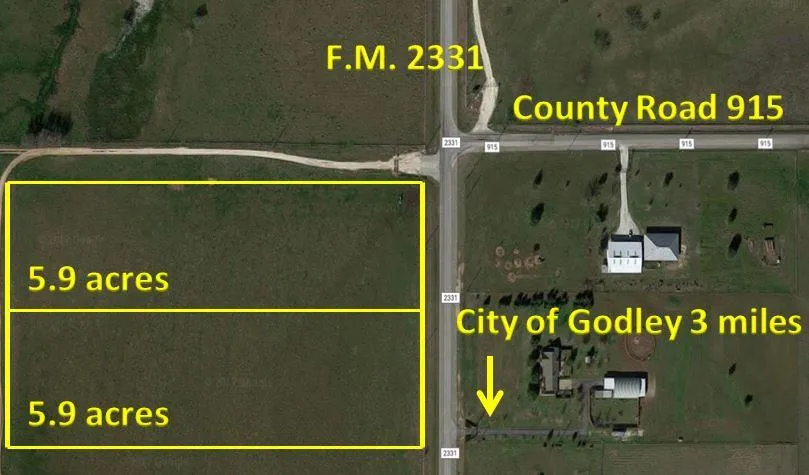 Location: (South Fort Worth Area) **See google maps 13401 FM 2331 Godley, TX 76044 -Land Sits on West side of FM 2331, Cross road is on East side of FM 2331 which is county road 915. Call Tyler For Gated Entrance Access.