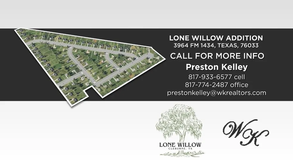 Welcome to Lone Willow Addition - Your Perfect Escape Near Cleburne Lake! Nestled on the picturesque west side of Cleburne Lake, Lone Willow offers the perfect blend of peaceful country living with easy access to city conveniences. Located just six miles from Cleburne and only ten miles from the Chisholm Trail Toll Road, this prime development provides quick connections to Highway 67, making your commute a breeze! Situated outside city limits yet within Cleburne's Extraterritorial Jurisdiction (ETJ), Lone Willow gives you the flexibility of rural living with the potential for future growth. Each homesite in Phase 1 has already been equipped with water taps by Johnson County Special Utility District (JCSUD), ensuring a seamless connection to start to your dream home build. For modern conveniences, United Cooperative Services is powering this development with electric service as well as fiber-optic high-speed internet, keeping you connected while enjoying the beauty of the Texas countryside. Whether you're looking to build your forever home or invest in a growing community, Lone Willow is the perfect place to put down roots. Don't miss out on this incredible opportunity! Contact us today for more details and to secure your spot in this stunning new development!The seller's are willing to offer concessions to assist with the buyer's closing cost and or buying the interest rate down, making this an excellent opportunity to secure your dream home with added financial flexibility. Interest rate as low as 4.99 percent with qualified buyer!