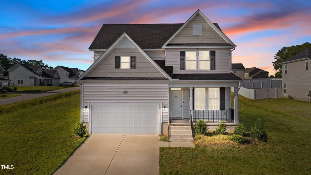 Charming rustic wood grain luxury vinyl plank flooring adorns the main living areas on the 1st floor. The dining room, situated off the foyer, features a coffered ceiling, chair rail with picture frame wainscoting, and a stylish brushed nickel chandelier. Adjacent to the dining area, the bright kitchen is equipped with recessed lighting, granite countertops, espresso-stained flat-panel cabinets, a center island, and stainless steel appliances, including a double-door refrigerator. The spacious first-floor owner's suite is highlighted by a trey ceiling and an updated ceiling fan. The owner's bath offers dual vanities and a walk-in shower with a corner bench. A large closet off the owner's bath provides convenient access to the laundry room. The kitchen flows into a vaulted family room, with recessed lighting, and a brushed nickel ceiling fan. The staircase to the second floor features an open railing on the first few steps and wrought iron pickets. The second floor includes a generous loft overlooking the family room, complete with an updated ceiling fan, as well as 3 additional spacious bedrooms with vaulted ceilings and a full bath. Out back, a concrete patio overlooks a large backyard and corner lot.