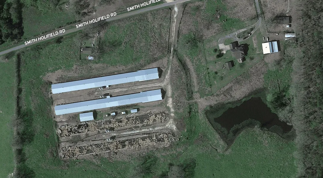 PROPERTY. The two existing broiler houses are 40 x 500 each and were previously contracted to Amick Farms. Two other houses on site burned, but the foundation pads are still in place. There is potentially room for two additional chicken houses, as well. The 2,000-square-foot barn contains a kitchen w/commercial stove, a half-bath, and a floored second level. A large compost shed is also on site. The property includes pasture land and a one-acre pond.