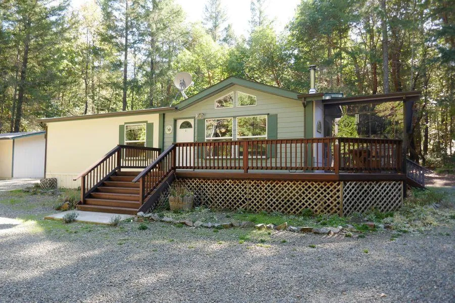 Enchanting 5+ acre property features gorgeous private park-like wooded setting & back on the market at no-fault of seller. Well-kept 2 bed 2 bath home w/ open floor plan airy vaulted ceilings + skylight. Living rm has barn door & professionally refurb. certified woodstove. L back entry mudroom has new washer/dryer. Spacious kitchen leads to dining rm but take your morning coffee to sun porch & watch wild turkeys, deer & squirrels... this 9x22 veranda overlooks fenced-in veggie garden w/ raised beds; pump house that has plenty of room for tools- new well motor draws 16GPM. Redwood wrap-around deck at front door faces newly pollinator garden... all part of living on this wonderful property. PLUS: a finished 12x16 cottage craft bldg & a 16x20 rec. bldg w/ L storage closet; a custom built cedar shed for firewood + many cords for yrs to come; a carport; a cart shed and 200-gal er potable water tank. Selma is 9 miles w/ scenic Lake Selmac along the way. Seller needs up to 45 days to vacate.