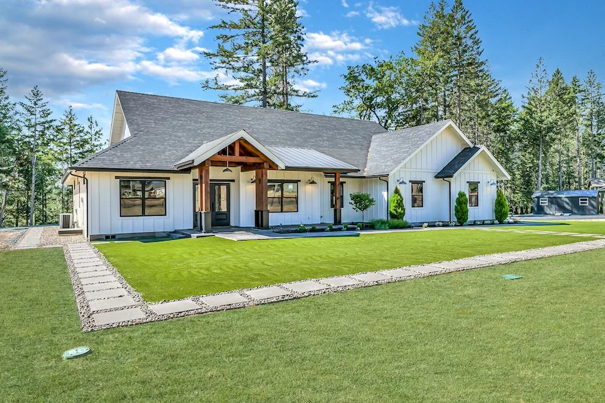 This 2022 custom-built masterpiece feels like it was pulled straight from your dream home vision board nestled beside the peaceful flow of Jumpoff Joe Creek. With over 2,500 square feet of smart design, this 3-bed, 2.5-bath home blends upscale finishes with serene natural views. The wide foyer welcomes you with warm timber-style LVP flooring & a layout that flows effortlessly. The open living, dining, & kitchen areas are perfect for slow mornings by the fireplace or lively evenings with friends. The kitchen features maple soft-close cabinetry, quartz counters, a dual oven with warming drawer, gas range, & a chef's pantry with sink & wine fridge. Privately tucked away, the primary suite comes complete with soaking tub, two-head shower, double vanity, boutique-style walk-in closet, & its own HVAC system! Outdoors, enjoy the hot tub, propane hookups, RV connections, storage shed, surround sound, & an electric privacy gate all in a setting that feels worlds away. Your dream home is here!