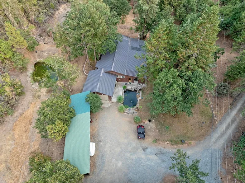 Incredible 19.61-acre wooded retreat featuring a spacious 1-bedroom, 2-bath, 2,208 sq ft home surrounded by nature. The open-concept layout offers abundant natural light and serene views through large windows. The kitchen boasts ample cabinetry and a generous walk-in pantry, while the living area centers around a cozy Toyotomi oil stove. The master suite includes a private bath with a large walk-in shower. A fully fenced 1-acre section is animal-ready ideal for pets or a small hobby farm. Relax on the covered patio overlooking a tranquil koi pond and enjoy watching wildlife. The property is richly forested with fir, pine, black oak, and madrone trees, with private trails weaving throughout. Additional features include an attached garage, a large power-equipped shop, extra storage, and a 4-car canopy for all your toys and tools. Peaceful, private, and packed with potential perfect as a hobby farm, retreat, or full-time residence.