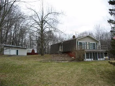 Rustic ranch walkout has beautiful country setting only 5.5 miles southeast of Vicksburg! Home has paved driveway and sits about 700 feet off the road. 24 x 40 pole barn has electric, concrete floor and 3 overhead doors (2 with electric openers)! There's also a small horse barn. Back acreage is rolling and wooded! Spacious kitchen has ceramic tile flooring and includes range, refrigerator & built-in dishwasher. Dining area has built-in china cabinet and sliding glass door to tiered deck and view of pond! Living room with hardwood floors has sliding glass door to deck. The walkout level has family room with beautiful brick woodburning fireplace and sliding glass door to aluminum screened-in porch. Home needs some paint and carpet but is truly an excellent value!