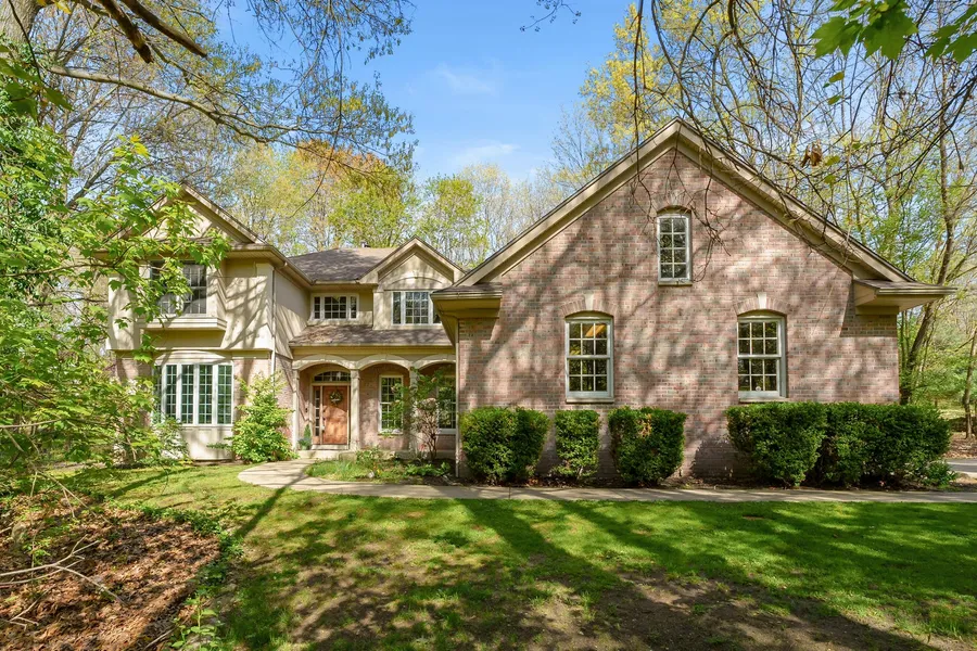 Located on a private wooded lot in the Hidden Lake community, this home features a two-story family room with a gas fireplace and a wall of windows. The main level includes a formal dining room and an updated kitchen with epoxy countertops, new backsplash, center island with gas cooktop, pantry, double oven, and beverage refrigerator. Adjacent to the kitchen is a screened porch. The main-floor primary bedroom has a freshly updated ensuite bath with double vanity, updated countertops and hardware, a refinished garden tub, separate shower, and walk-in closet. The upper level offers three additional bedrooms and a full bath with a double vanity. The finished lower level includes a second living area with an egress window, wet bar, gym, sauna, and full bath. Exterior features includes