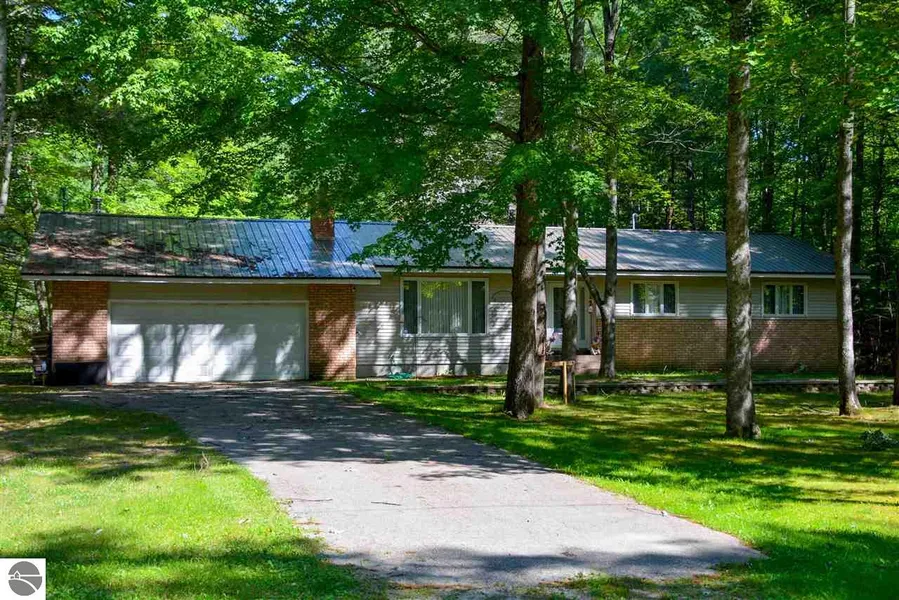 Located on a secluded three parcels with shared frontage on the all-sports Bear Lake! This cozy ranch is a fantastic way to get closer to nature! Featuring convenient main floor living with a quaint kitchen, bar seating, formal dining area, and an inviting living room with built-in bookshelves and timeless wood burning stove set into a brick fireplace. This home has three bedrooms with a full bath for family and guests and an extra half-bath off the primary bedroom. Also boasts a spacious attached 24x36 garage with an additional detached 24x26 garage with plenty of space for tools, boats, and more. Close to many ORV trails and the shared frontage has beach and boat launch. Only 20 minutes from Kalkaska. A great find!