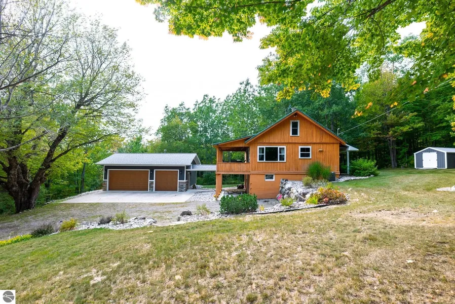 Escape to your private 60-acre retreat! This quaint log cabin offers the ultimate "up north" experience. Step inside to find vaulted ceilings with beautiful log beams, creating a cozy and authentic cabin feel. With three bedrooms and 2 baths, there's plenty of space for family and guests. The home features a walkout basement with a family room, and ample storage. The beautiful large stone retaining walls hug this sweet home and gives it a grand setting . The home has a newer metal roof, a furnace with central air conditioning, a hot water tank, and newer windows and doors, ensuring comfort and peace of mind. The trail system is not far, so get your sleds and ATV's ready for an Up North adventure, in sand or snow. Take in the expansive hillside views from the large, two-tiered covered porch—the perfect spot to relax and immerse yourself in nature. The property, located on a county-maintained road, is also close to state land, providing endless recreational opportunities. A new garage with a convenient covered walkway completes this exceptional package, offering plenty of space for all your gear. This is the up north haven you've been waiting for! All information deemed accurate, but should be verified